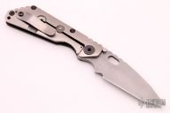 This DDC SNG by Duane Dwyer features a chisel ground blade with, thumbhole and dual thumbstuds. The handle has a carbon fiber and satin finished titanium frame with a titanium tip up pocket clip.  Scratches are visible on the blade and frame, fair condition.