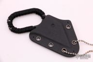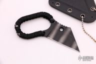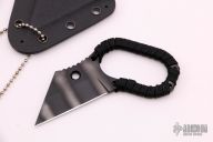 This Tiger Striped Straight by Hideaway Knives features a tiger striped wharncliffe blade with notched thumbrest and cord wrapped grip, .130" blade stock and 1.055" blade depth, full tang construction. Comes with a kydex neck sheath and original packaging. New from maker.