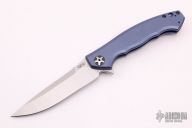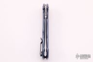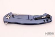 This 0452TIBLU Sinkevich designed folder from Zero Tolerance features a drop point blade with swedge, notched thumbrest and flipper. The blade has tumble finished flats and satin grinds. The handle has an anodized titanium frame with a black coated stainless steel, tip up pocket clip, left or right reversible. Includes original box and papers. Serial # 0170. Excellent condition.