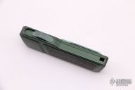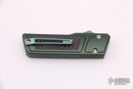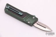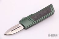 This Akuma OTF Auto by No Limit Knives features a satin finished double-edged blade with carbon fiber inlays. The handle has a green aluminum frame with carbon fiber inlays, tip up anodized titanium clip. Comes with a zippered case. New from maker.