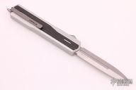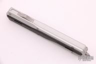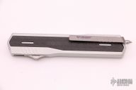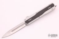 This Night Stalker OTF Auto by No Limit Knives features a satin finished double-edged blade. The handle has a silver aluminum frame with carbon fiber inlays, tip down titanium clip. Comes with a zippered case. New from maker.