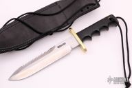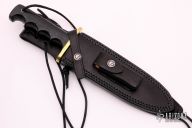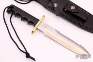 This Model 14 from Randall Made Knives features a satin finished spear point blade with sharpened top edge and sawteeth, .223" blade stock and 1.409" blade depth, full tang construction. The handle is comprised of a brass guard and black linen micarta handle. Comes with black leather sheath. Excellent condition.
