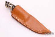 This drop point hunter by JB Moore features a mirror polished 3.75" blade with .190" blade stock and .988" blade depth, full tapered tang construction, 8.25" overall. The handle has a nickel silver guard, sheep horn scales with red liners/spacers, nickel silver pins and lanyard hole. Comes with a brown leather sheath. #1375 on blade. Has some light scratches, otherwise excellent condition.