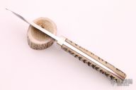 J. B. Moore is a member of the Knife Guild. He began making knives in 1978."The custom knife user and collector continually demands better quality knives for his investment. I strive to meet that demand with each knife I make. An extra effort is made to improve each knife over the last. Having never satisfied myself, I can only hope that my work pleases you, or that I will reach a point sometime in the future when my knives spark your interest.Each knife is made by the stock removal method and constructed entirely by hand. I use the best material available to knifemakers today and guarantee each knife against defects in workmanship."