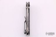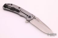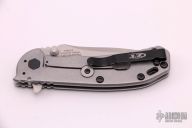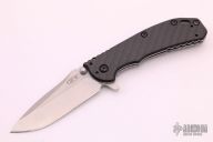 This 0566 Hinder Design Flipper by Zero Tolerance features a tumble finished drop point blade with swedge, dual thumb studs, notched thumb rest and flipper. The handle has a carbon fiber scale over a titanium liner and a tumbled titanium lockside over black barrel spacers. The black coated steel tip up clip is reversible for right or left hand carry. S/N 2714.  Excellent Condition.