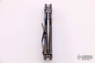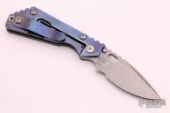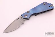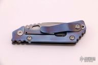 This PT by Mick Strider features a stonewashed blade with notched thumbrest and thumbhole. The handle has a blue anodized titanium frame with matching tip up clip. New condition.