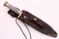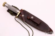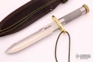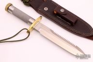 This Model 18-7.5 Attack Survival from Randall Made Knives has a 7.5" blade with sharpened top edge and sawteeth, .217" blade stock and 1.321" blade depth, hidden tang construction. The handle has a brass guard and knurled butt cap, knurled stainless steel handle. Comes with a WAXED brown leather sheath and original paper wrapping. Cap is CROSS THREADED, (we tried, couldn't budge it.) Other than that, excellent condition.