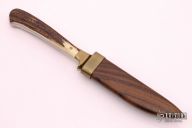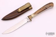 This Boot Knife by Ralph Bone features a satin finished blade with .185" blade stock and .684" blade depth, full tang construction. The handle has brass bolsters, stag scales. Comes with a wooden scabbard with brass collar and clip. Stamped "N108". Has some light scratches, otherwise excellent condition.