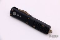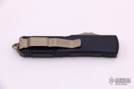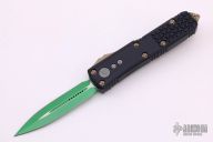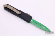 This UTX-85 OTF Automatic from Microtech features a green cerakoted double edged blade with fuller. The handle is comprised of a black aluminum tri grip frame with bronzed steel thumb slide, clip and glass breaker. Dated 03/2021 with a S/N of 5036. Includes original box and papers. Excellent condition.