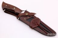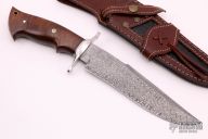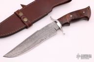 This knife by Bobcat Knives features a Damascus recurve blade with false top edge, .170" blade stock and 1.692" blade depth, hidden tang construction. The handle has a stainless steel fluted guard, nicely contoured walnut wood grip. Comes with a brown leather sheath. Excellent condition.