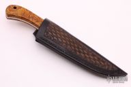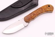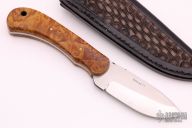This hunter/skinner by Barbara Baskett features a hand rub satin finished blade with fileworked spine, .127" blade stock and 1.273" blade depth, full tang construction. The handle has maple burl wood scales with brass pins. Comes with a hand tooled brown/black leather sheath. Has a little light oxidation on the blade, otherwise good condition.