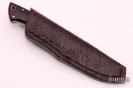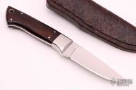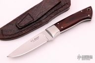 This Hunting knife by Cedric Pannell features a mirror polished blade with .156" blade stock and .993" blade depth, full tapered tang construction. The handle has mirror polished 303 stainless steel bolsters, cocobolo scales. Comes with a brown leather sheath and COA dated 2010. Excellent condition.
