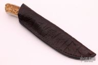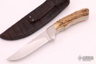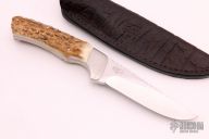 This knife by George Muller features a hand rub satin finished blade with mirror polished flats and fileworked spine, .193" blade stock and 1.171" blade depth, full tapered tang construction. The handle has dovetailed and stippled stainless steel bolsters, stag scales and stainless steel pins. Buffalo hide brown leather sheath. Has a few light scratches, otherwise excellent condition.