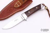 This Drop Point Full Integral hunter by George Trout features a mirror polish blade with fileworked spine, .156" blade stock and 1.044" blade depth at the ricasso, full tapered tang. The handle has an integral guard and pommel with desert ironwood burl scales and mosaic pins, lanyard hole at the butt. Comes with a brown leather sheath for a Randall model 26-4, it fits perfectly. Excellent condition. Comes with COA dated 2/20/2011