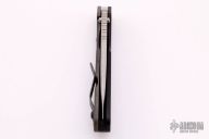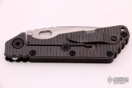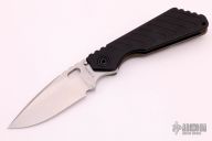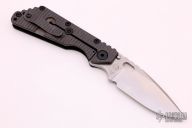 This Mick Strider SMF Fatty framelock folder features a stonewashed blade with thumbhole and notched thumbrest. The handle has a black aluminum and flamed titanium frame with titanium clip, tip up carry. Jimping on blade spine. Nice lockup, detent, and blade seating. Excellent condition.