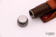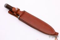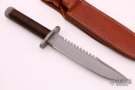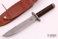 This survival knife by Timberline features a bead blasted spear point blade with serrated top edge and 10 saw-teeth on blade spine. .249" blade stock and 1.318" blade depth, hidden tang construction. The handle has a bead blasted titanium double guard, hollow cord wrapped handle, and stainless steel removable butt cap with an O-ring to make it water-proof. Comes with brown leather sheath that has a leather flap with a snap covering a honing stone that is embedded in the sheath. Inside the handle is a roll-up kit with a fire stick, and slots to hold other items. The cord that is around the handle is also one piece of cord that can be removed for survival use. The removable butt cap has a polished flat inside that can be used for signaling. The blade is stamped "424SA". This knife was well-thought-out and provides everything possible for survival. Has some light scuffs, otherwise excellent condition.