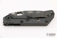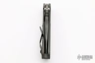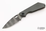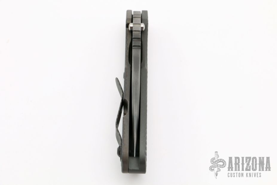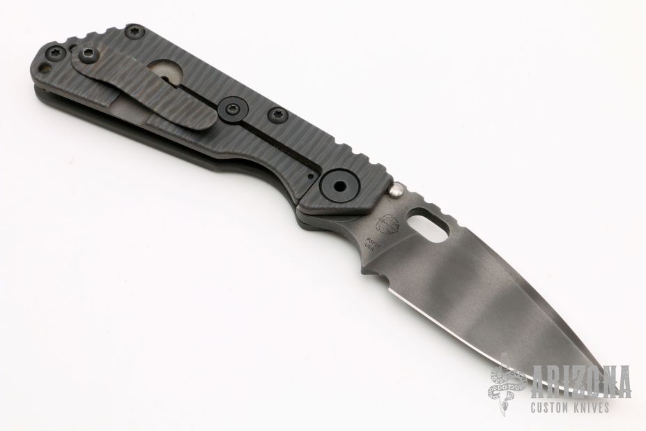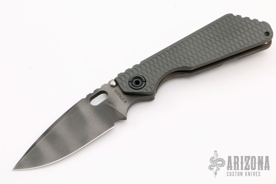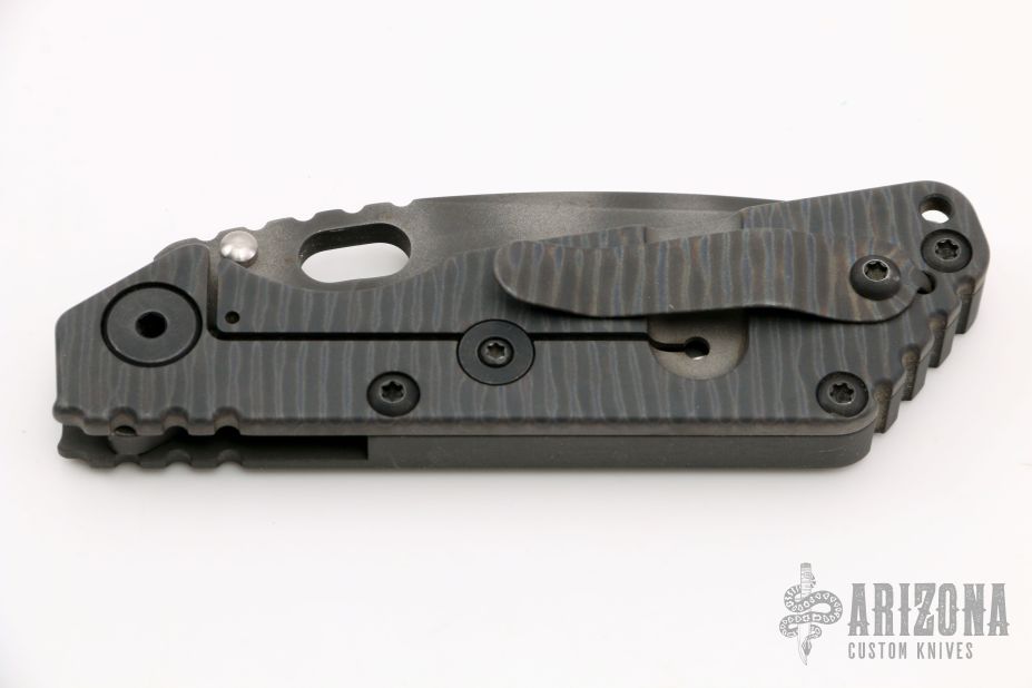 This SNG framelock folder by Mick Strider features a tiger stripe spear point blade and a dimple pattern grey aluminum and flamed titanium frame and tip up titanium clip. Includes a "Lock Bar Stabilizer" for maximum reverse lock retention. Nice detent, lockup and blade seating. Has a couple light scuffs, otherwise excellent condition.