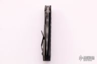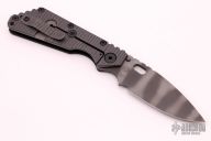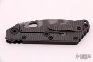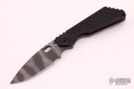 This Mick Strider SMF Fatty framelock folder features a tiger striped blade with thumbhole and notched thumbrest. The handle has a black aluminum and flamed titanium frame with titanium clip, tip up carry. Jimping on blade spine. Nice lockup, detent, and blade seating. New condition.