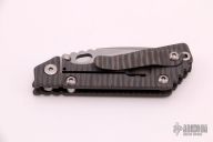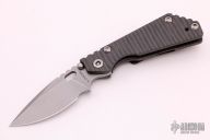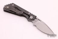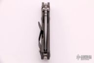 This PT by Mick Strider features a stonewashed blade with notched thumbrest and thumbhole. The handle has a flame finished titanium frame with matching tip up clip. New condition.