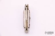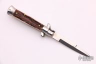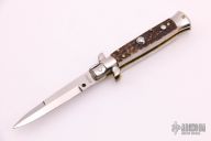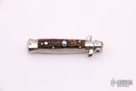 This Swivel Bolster Auto features a mirror finish spear point blade. The handle consists of nickel silver bolsters and stag scales over brass D-Stamp liners and stainless steel backspacer. Steel push button. Has a few light scratches, otherwise excellent condition.