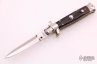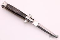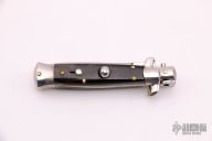 This Swivel Bolster Auto features a mirror finish spear point blade. The handle consists of nickel silver bolsters and buffalo horn scales over brass D-Stamp liners and stainless steel backspacer. Steel push button. Has a few light scratches, otherwise excellent condition.
