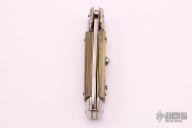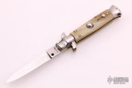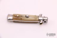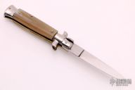 This Swivel Bolster Auto features a mirror finish spear point blade. The handle consists of nickel silver bolsters and honey horn scales over brass D-Stamp liners and stainless steel backspacer. Steel push button. Has a few light scratches, otherwise excellent condition.