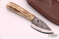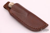 The knife by ML Knives, features a clip point blade forged out of 1095 high carbon steel. .106" Blade Stock 1.06" Blade Depth. The knife has a full tang construction; handle material consists of stag.  The pins in the handle are made from brass. Comes with a hand stitched leather sheath made of 100% American Tanned leather along with a certificate of authenticity. Excellent Condition.