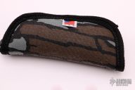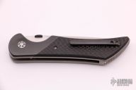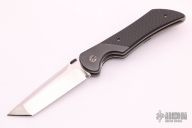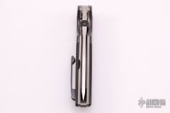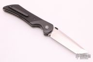 This Stingray from Sal Manaro features a hand rub satin finished tanto blade with swedge, Boye Dendritic Cobalt, checkered zirconium thumb disc and notched thumbrest. The handle is comprised of dovetailed zirconium bolsters, carbon fiber scales, orange peel finished titanium liners and checkered backspacer, tip up zirconium clip. Smooth action. Nice blade seating, detent, and lockup. Excellent condition. Includes a zippered case.