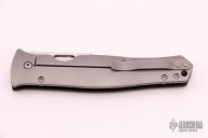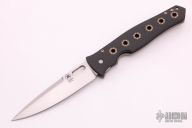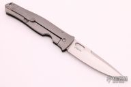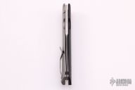 This Dr. Death by Tom Mayo features a hand rubbed satin finish spear point blade with false top edge and thumbhole. The handle has a carbon fiber front scale with mosaic pin inlays, bead blasted titanium frame with matching tip up clip and titanium standoffs. Nice detent, lockup and blade seating. Comes with a zippered case. Excellent condition.