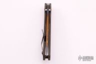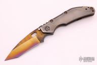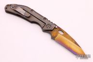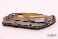 This DDC BBN by Duane Dwyer features a bronze/purple SM-100 blade with thumbhole. The handle has a milled and flame finished titanium frame with a matching tip up titanium clip, anodized titanium hardware. Nice detent, lockup and blade seating. Excellent condition. Comes with zippered case.