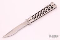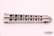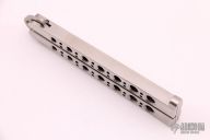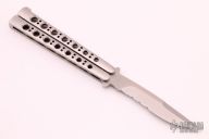 The model 45s by Benchmade features a spear point partially serrated blade with false top edge. Stainless steel skeletonized handles with T latch. Has a few light scratches, otherwise excellent condition. Comes with a original nylon sheath.