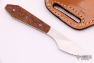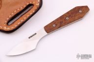 This Coffin Handle Caper by James Scroggs features a satin finished blade with full tang construction, .121" blade stock and .862" blade depth. Scales are stabilized Madrone Burl. Comes with a brown leather sheath by Rowe's Leather. New from maker.