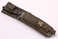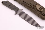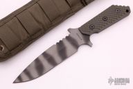 This MK1 Model 10 by Mick Strider features a tiger striped spear point PSF27 blade with notched thumbrest, .205" blade stock and 1.43" blade depth, full tang construction. The handle has green gunner grip G-10 scales. Comes with a nylon sheath. Excellent condition.