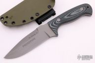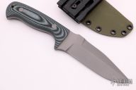 This Prototype Practical Carry Knife by Mike Mooney features a drop point bead blasted blade with sharpened top edge, .221" blade stock and 1.516" blade depth, full tang construction. The handle has black/green G-10 scales. Includes a kydex sheath with TekLok and a zippered case. Excellent condition.