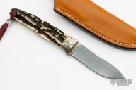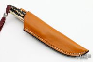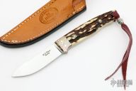 This Knife from Mr. Pease features a hand rub satin finished blade with .153" blade stock and .768" blade depth, full tapered tang construction. The handle has mokume bolsters, stag scales with mosaic pins. This piece is new from Mr. Pease and comes in custom leather sheath by TFC Leather.