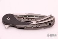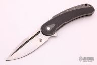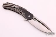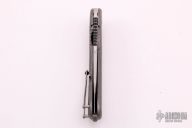 This Bodega Slim from Todd Begg Knives features a satin finished blade with notched thumbrest, fullers and flipper, .152" blade stock. The handle has a stonewashed titanium frame with carbon fiber inlays, titanium backspacer with fuller, tip up titanium pocket clip with cracked ice finish and ceramic ball inset. Has excellent detent, lockup and blade seating. Features a ceramic IKBS pivot. Knife is in excellent condition. #18 of 30