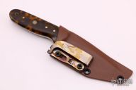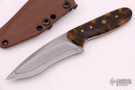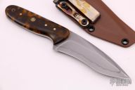 This knife by Joe Watson features a hand rub satin finished blade with nice hamon, .188" blade stock and 1.391" blade depth, full tapered tang construction. The handle has faux tortoise shell scales with brass and mosaic pins. Comes with a kydex sheath with clip. Excellent condition.