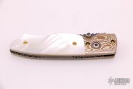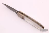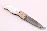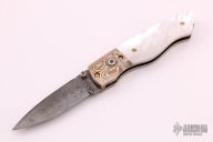 This Gentleman's Button Lock from Jason Williams features a drop point Damascus blade with swedge and a single thumbstud with blue stone inlay. The handle is comprised of mokume bolsters and mother of pearl scales over anodized titanium liners, fileworked Damascus backspacer, gold plated screws. #216 inside backspacer. Excellent condition.