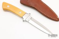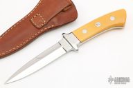 This Integral Dagger by Ted Dowell features a mirror polished double edged blade with .227" blade stock and .989" blade depth, full integral tapered tang construction. The handle has yellow Westinghouse paper micarta scales with red liners. Comes with a brown leather sheath. Excellent condition.