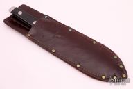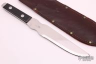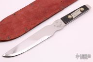 This Tru-Balance throwing knife features a mirror polished blade with .182" blade stock and 1.624" blade depth, full tang construction. The handle has black paper micarta scales with hand peened rivets. Comes with a brown leather sheath. Excellent condition.