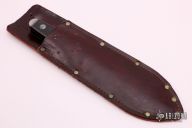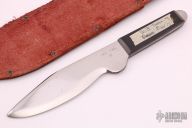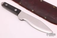 This Tru-Balance throwing Knife features a mirror polished blade with .188" blade stock and 1.811" blade depth, full tang construction. The handle has black paper micarta scales with hand peened rivets. Comes with a brown leather sheath. Has some light scratches, otherwise excellent condition.