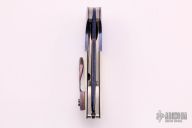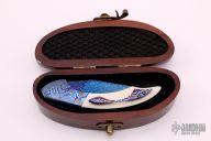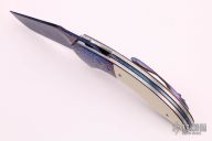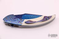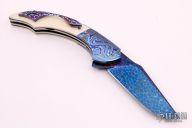 This knife by Damien Krause features a Dragon Skin Damascus blade with flipper. The handle has zircuti bolsters, walrus ivory scales with black liners, polished titanium liners, floating dragonskin Damascus backspacer, tip up mokuti clip.  Nice detent, lockup and blade seating.  Includes original wood display case.  Excellent Condition.