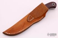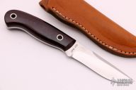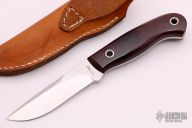 This hunter by Mike Irie features a hand rubbed satin finish blade with notched thumbrest, .123" blade stock and .886" blade depth, full tang construction. The handle has maroon linen micarta scales. Excellent fit and finish. Brown leather sheath. New from maker.
