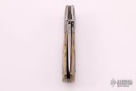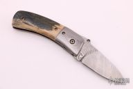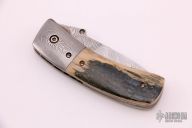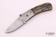 This knife by Kim Breed features a drop point Damascus blade with single thumbstud with a synthetic sapphire inlay. The handle has Damascus bolsters, mammoth ivory scales, anodized and orange peel finished titanium liners, Damascus backspacer. Nice lockup and detent. Comes with a zippered case. Excellent condition.