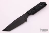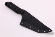 This Mick Strider DBL has a black tanto blade with notched thumbrest, .188" blade stock and a blade height of 1.303". The handle has black G-10 scales with MEFP, lanyard hole in pommel. Includes kydex sheath. Excellent condition.