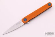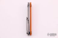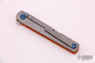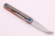 This MS3 Limited Edition by Michael Zieba features a stonewashed AEB-L blade with flipper. The handle has a ornage G-10 and blasted titanium frame with matching tip up clip and anodized titanium hardware, has stainless steel lockface insert. Rides on bearings, nice detent, lockup and blade seating. Excellent condition. Comes with original box.