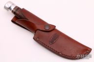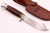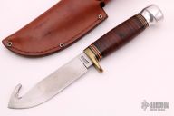 This Hunter by Marbles features a satin finished blade with gut hook, .168" blade stock and .945" blade depth, hidden tang construction. The handle has a brass guard with stacked leather grip and black/brass/red/white spacers and aluminum cap. Comes with original brown leather sheath and box. Has some light patina and scratches, otherwise good condition.