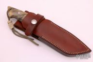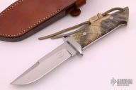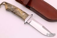 This Chute Knife by Tim Hartman features a mirror polished blade with sharpened top edge, .211" blade stock and 1.113" blade depth, full tapered tang construction. The handle has mirror polished 416 stainless steel guard, buckeye burl scales with black liners, stainless steel pins and lanyard hole. Comes with a brown leather sheath. Has a few light scratches, otherwise excellent condition. Comes with zippered case and COA #204.