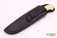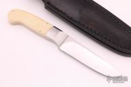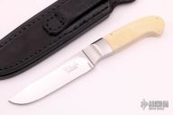 This knife by Robert Crowder features a mirror polished blade with .137" blade stock and .984" blade depth, full tapered tang construction. The handle has dovetailed stainless steel bolsters and walrus ivory scales. Comes with a black leather sheath. Excellent condition.