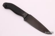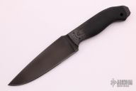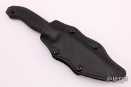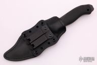 A custom Kydex-lined black leather sheath comes with this knife and compliments the all-black fixed blade. The sheath allows for multiple carry positions and fixtures. A feature of the sheath is that the knife can be drawn with little to no noise. The sheath combines the best of leather and Kydex into a truly functional rig.